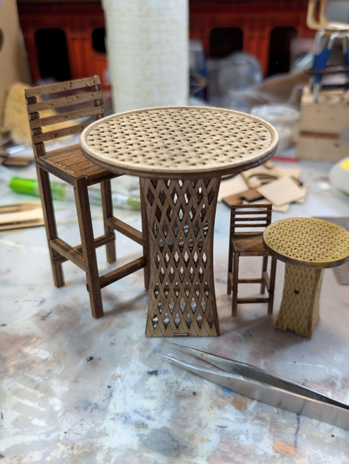 The 1" and 1/2" table and chairs will be made of matboard, while the 1/4" table and chairs will be made of watercolor paper.